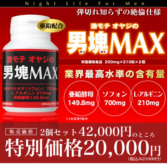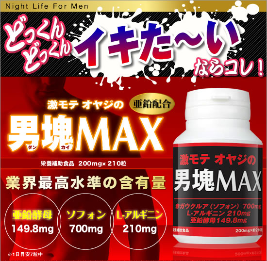 激モテオヤジの男塊MAXは、精力減退に悩む男性のナイトライフをサポートする目的で開発されました。 タイの山岳地でしか摂れないとても貴重な赤ガウクルア(ソフォン:学名ブテアスペルバ)を贅沢に使った滋養強壮・精力剤です! 日本では赤ガウクルアを使ったサプリメント自体がとても珍しく、しかも1日分で700mgも赤ガウクルア(ソフォン)を配合したものは、サプリ業界でも特別な存在です。 その他にも亜鉛酵母を約150mg、L-アルギニンを210mgと雄の種・精子の製造に関わるミネラルとアミノ酸をたっぷり配合しました。 体の奧からみなぎるパワーを実感してください。