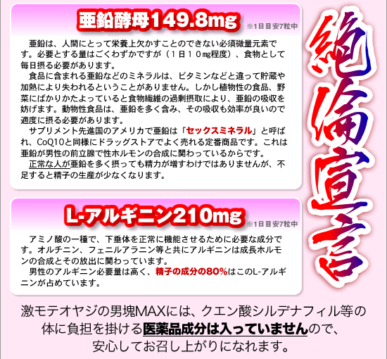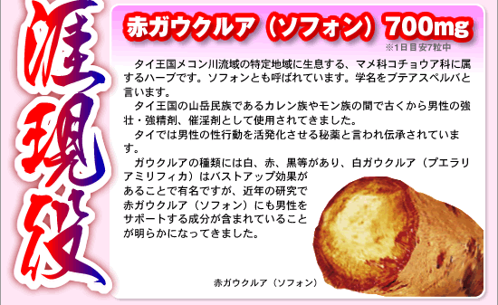 激モテオヤジの男塊MAXは厳選された貴重なタイ産の赤ガウクルア(ソフォン)を高純度で抽出し、1日分で700mgと他に類を見ないほど贅沢な量を配合しました。製造は徹底した衛生管理の基で作られた安心の国内品です。 主原料である赤ガウクルア(ソフォン:学名ブテアスペルバ)は安心を保証する分析証明書付きのホンモノです。 激モテオヤジの男塊MAXは即効性を売り物にしている医薬品まがいの商品ではありません。じっくりと自信を取り戻すタイプのサプリメントです。クオリティを求める本物志向の方をサポートする精力剤であることをご理解の上、ご購入ください。 |